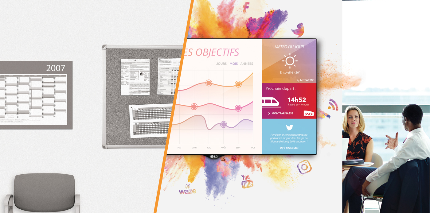 C’est l’héritier logique du panneau de liège et de l’affichage papier. Il permet de fluidifier la transmission d’information vers différents types de publics (clients, visiteurs, collaborateurs,…).